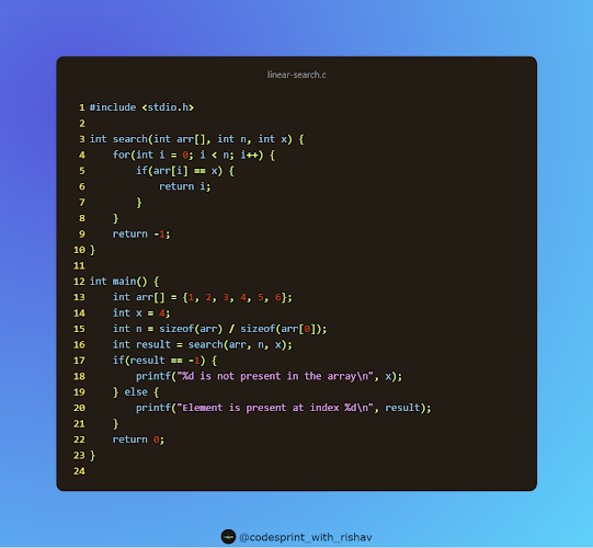 In this example, the linearSearch() function takes in two arguments, an array arr and an element x to search for. Inside the for loop, the function checks if each element of the array is equal to x. If a match is found, the function returns the index of that element. If the end of the loop is reached without finding a match, the function returns -1.