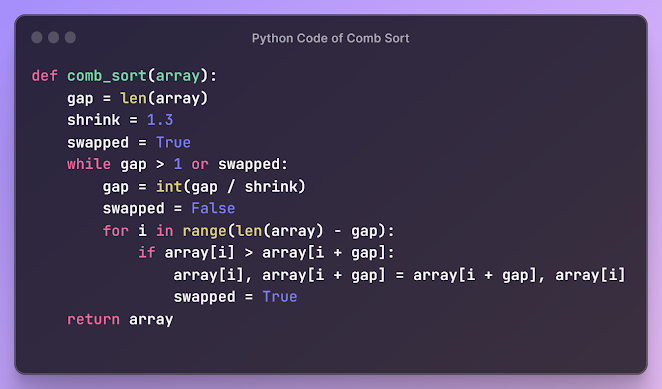 In this implementation, array represents the input list to be sorted, gap represents the size of the gap between elements being compared, shrink represents the factor by which the gap is reduced during each pass of the algorithm, and swapped is a flag indicating whether any elements were swapped during the most recent pass.